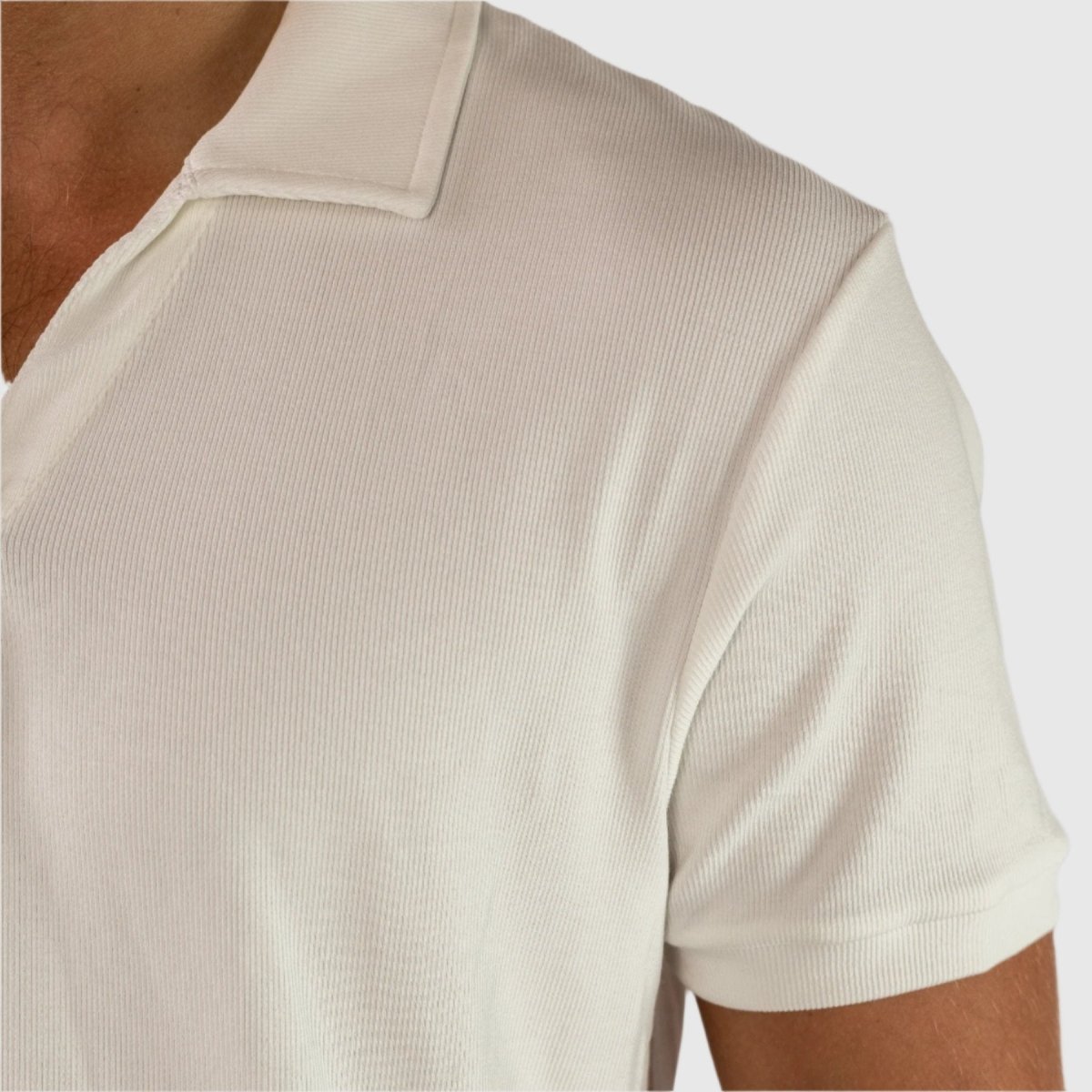 Das weiße Poloshirt aus Viskose-Strick mit offenem Kragen für Herren hat eine figurschmeichelnde, sportliche Passform und einen luxuriösen Viskose-Stretchstoff für ultimativen Komfort in einem modernen Stil mit offenem Kragen ohne Knöpfe.