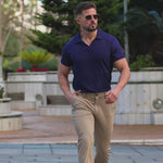 Das Herren-Poloshirt mit offenem Kragen in Marineblau hat eine körperbetonte sportliche Passform und besteht aus einem hochwertigen Viskose-Stretchstoff für ultimativen Komfort in einem modernen Stil mit einem knopflosem offenem Kragen