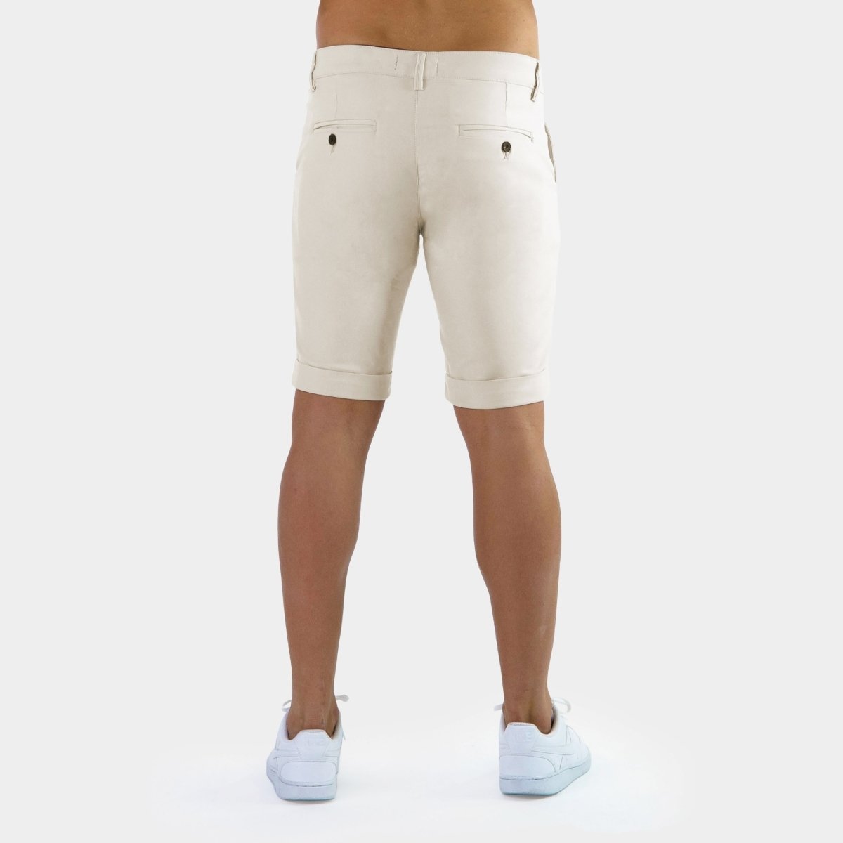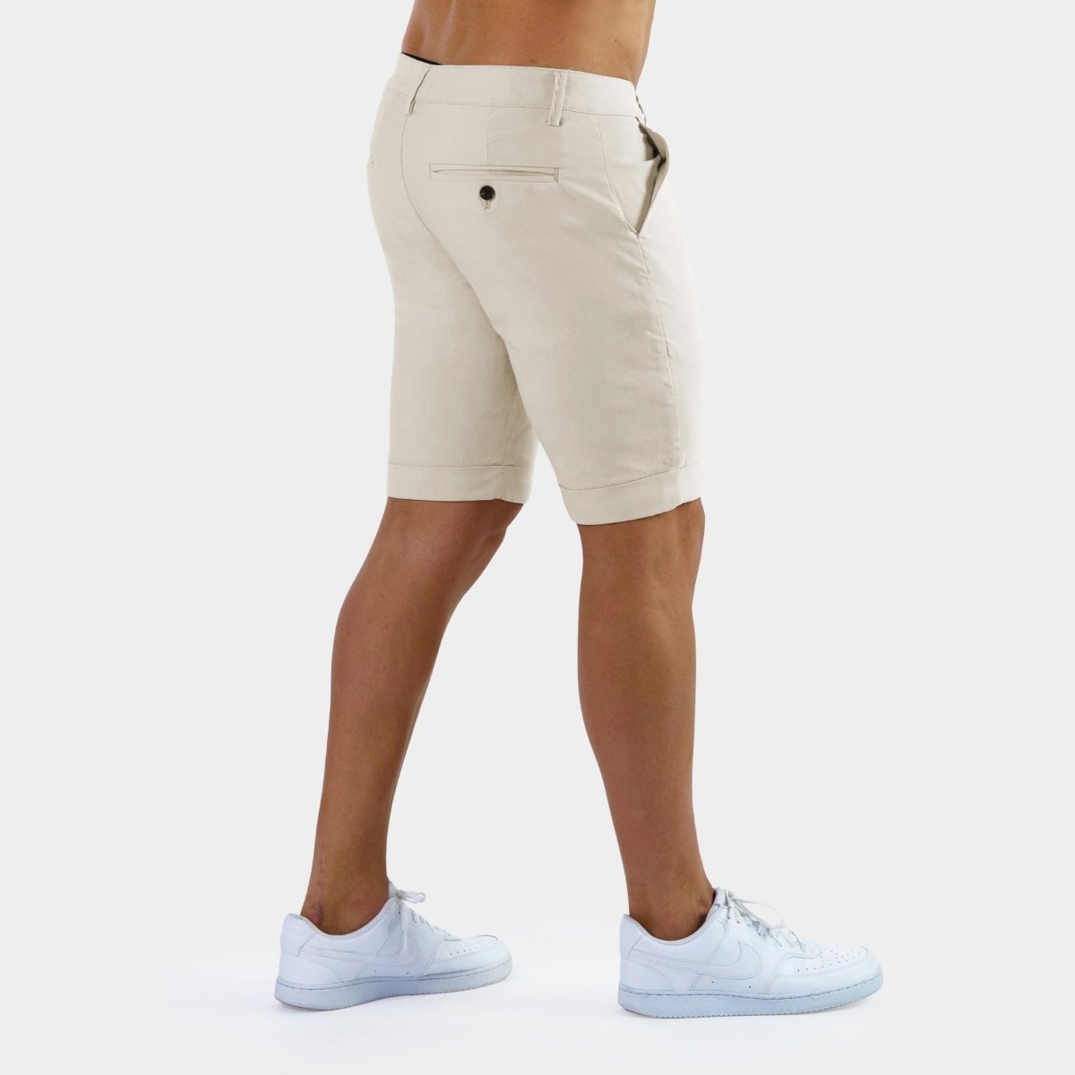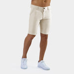 mens 9" cream Stretch chino shorts summer with white linen shirt