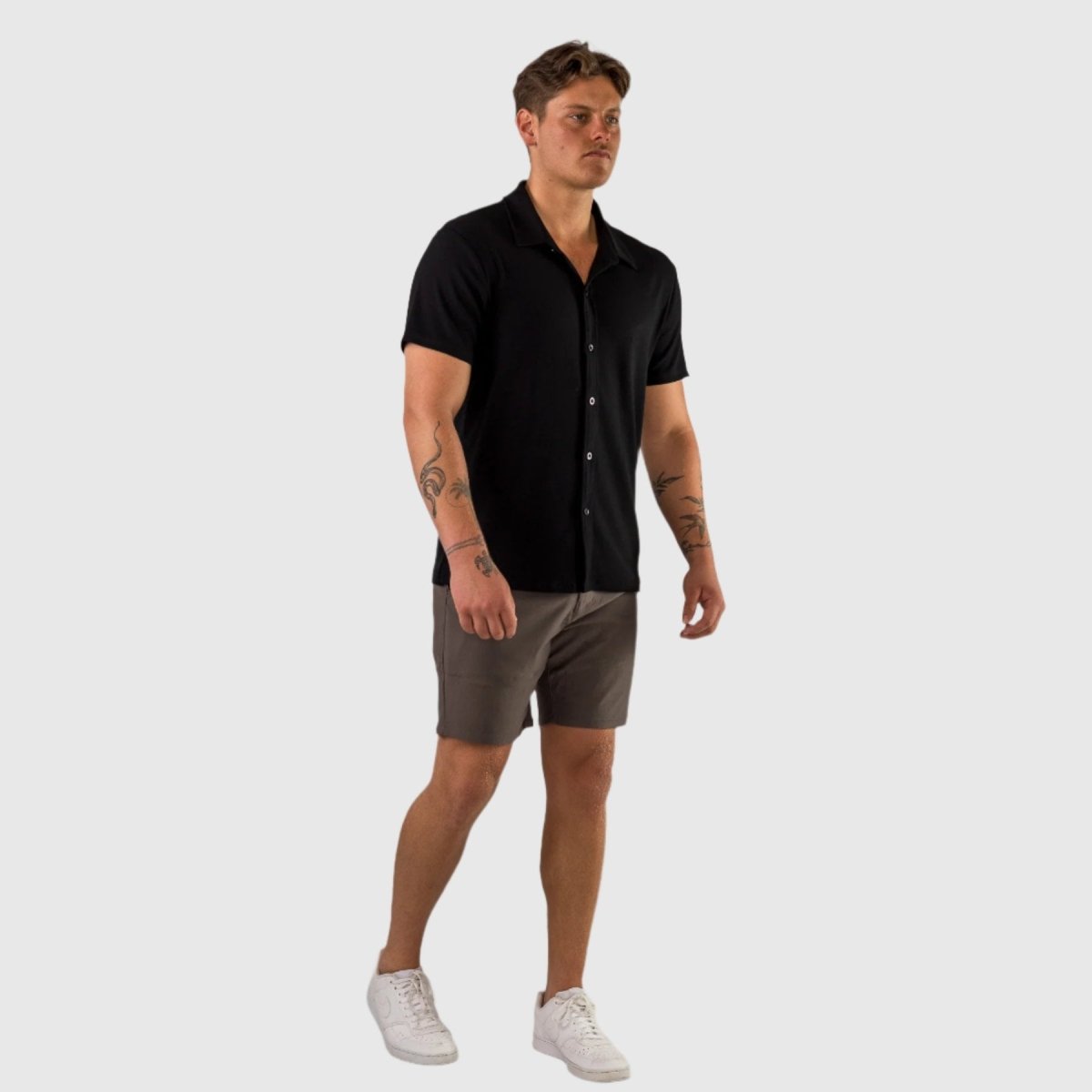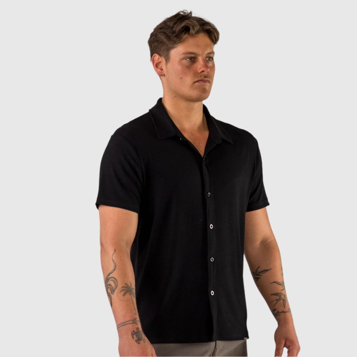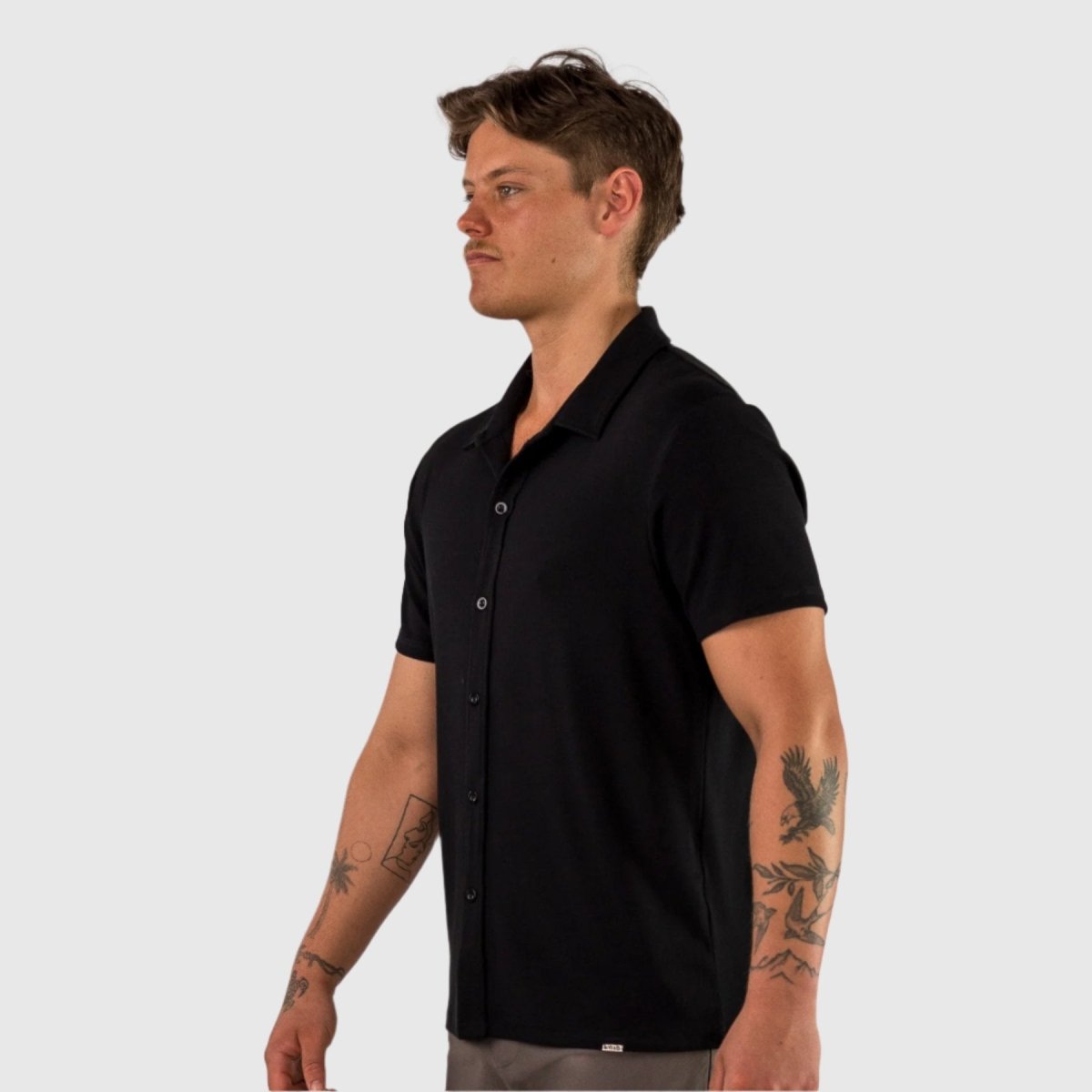 ブラックのメンズニットレーヨン半袖シャツは、体型を引き立てるアスレチックフィットで、究極の快適さを追求した高級レーヨンストレッチ生地を使用し、クラシックなボタンアップスタイルのモダンなデザインです。