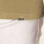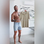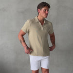 Polo Rajut Rayon Leher Terbuka Lelaki dalam warna Oat mempunyai potongan atletik yang menyerlahkan bentuk badan, dengan fabrik regangan Rayon mewah untuk keselesaan maksimum dalam gaya moden yang menampilkan leher terbuka tanpa butang