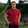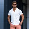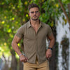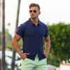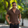 Het heren tricot viscose shirt met korte mouwen in walnoot heeft een lichaamsvormgevende atletische pasvorm, met een luxe rekbare stof voor ultiem comfort in een moderne stijl met een klassieke knoopsluiting.