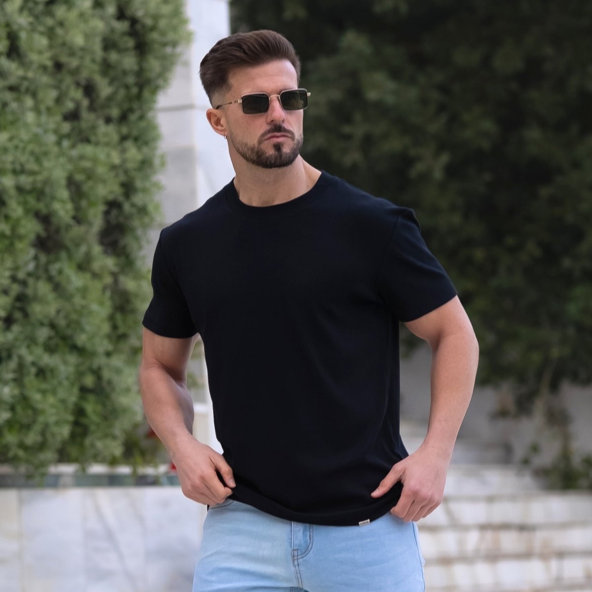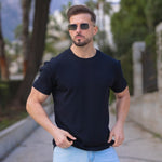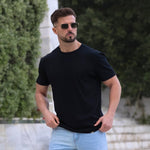 The Men's Deluxe Stretch Knit T-Shirt in Black has a physique flattering athletic fit, with a deluxe viscose stretch fabric for ultimate comfort in a modern style