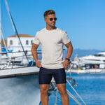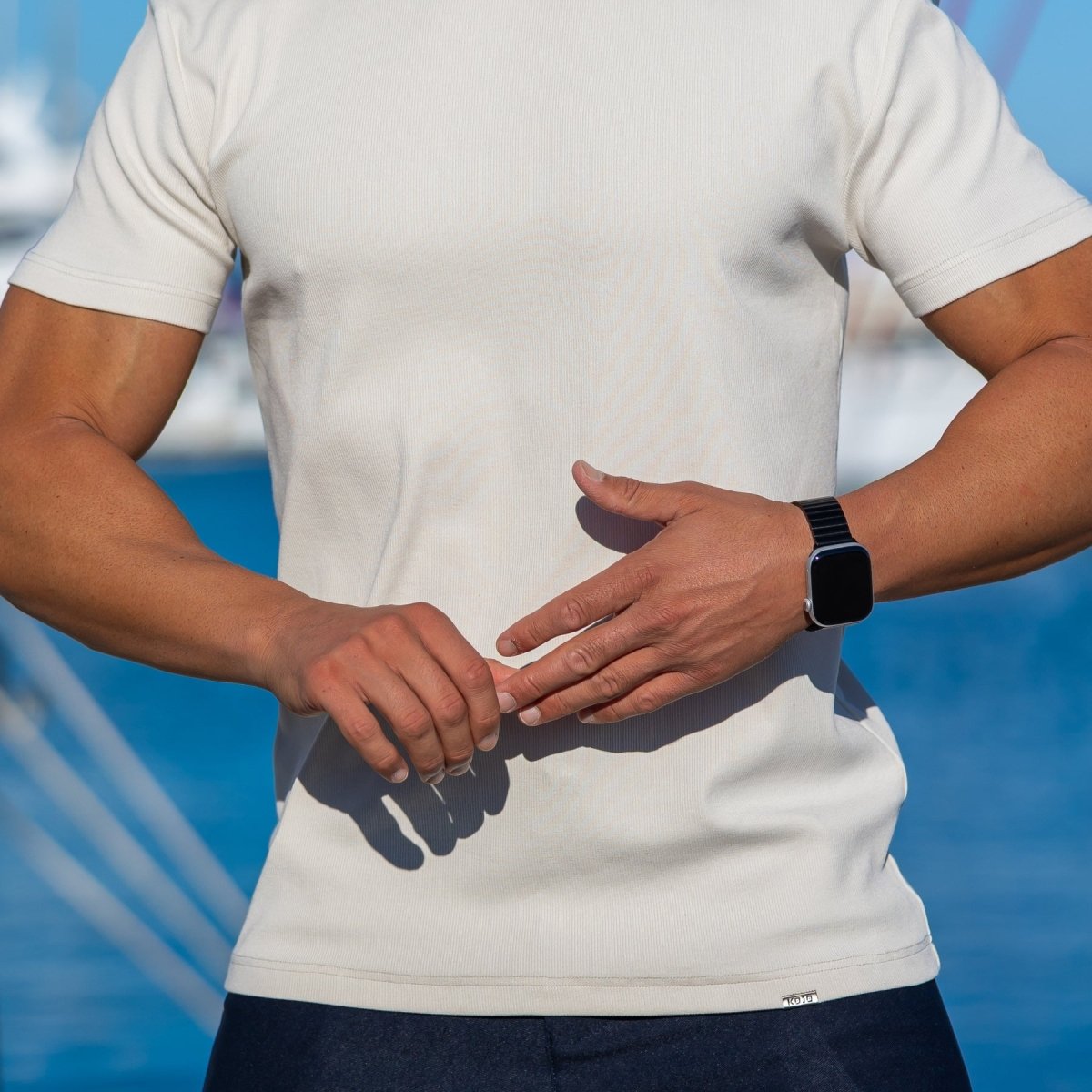 The Men's Deluxe Rayon Knit T-Shirt in Stone has a physique flattering athletic fit, with a deluxe Rayon stretch fabric for ultimate comfort in a modern style